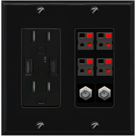 RiteAV 4 Speaker 2 Port Coax Cable TV Wall Plate - USB Outlet [Black/Black]
