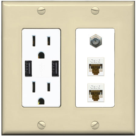 Increase quantity for RiteAV - 2 Port Cat6 Ethernet 1 Coax Cable TV Wall Plate - USB Outlet [Ivory/White]