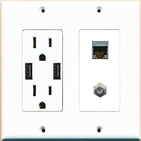 RiteAV 15A 125V Power Outlet with 2 Powered USB Ports and 1 x Cat6 Shielded Ethernet 1 x Coax Cable Decorative White Wall Plate