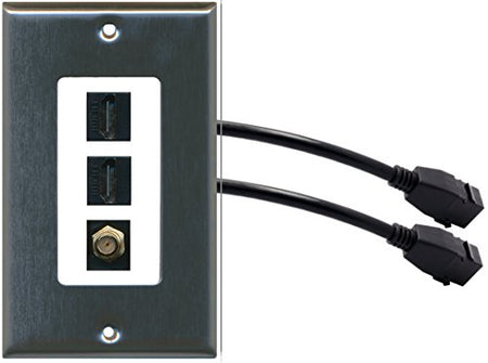 RiteAV (1 Gang Decorative) 2 HDMI Black Coax Wall Plate w/ Pigtail Extension Cable Stainless Steel on White