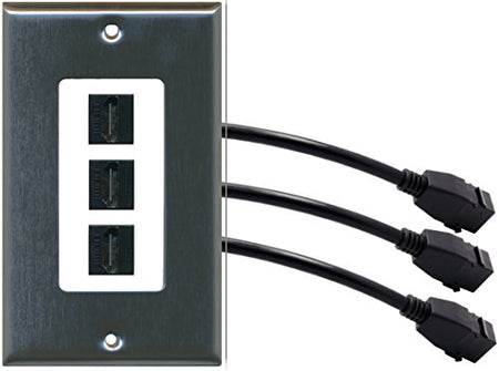 RiteAV (1 Gang Decorative) 3 HDMI Black Wall Plate w/ Pigtail Extension Cable Stainless Steel on White