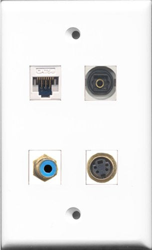 RiteAV 1 Port RCA Blue and 1 Port S-Video and 1 Port Toslink and 1 Port Cat5e Ethernet White Wall Plate