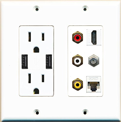 RiteAV 15 Amp 125V Power Outlet (2 Powered USB Charger Receptacle) Cat5e Coax Composite Hdmi Wall Plate