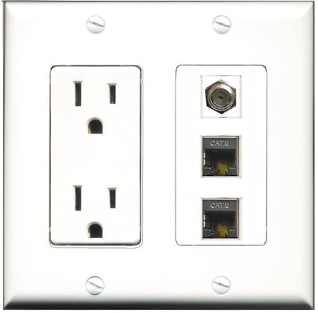 Please note: It is required to install this item in a divided outlet box. Recommended compatible outlet boxes Carlon BH234R (Old work). This is a 2 Piece Decorative Wall Plate (plate and plate cover). Tooless connection, Just plug one cable into the front and one into the back. Outlet needs to be hard wired as a regular outlet. High quality, screws included. Fits standard outlet boxes, decora(tive) plates and mounting brackets. Female on both sides of the plate jacks for easy plugin. 4 inch distance between screws. This is not a GFCI outlet and is not to be installed near or behind a kitchen sink, bathtub, bathroom or within 12-15 feet of any source of water. Must be installed into a new or existing plastic or metal outlet electrical box for safety. Do not install this with a drywall only mounting bracket.