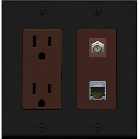 RiteAV - 15 Amp Power Outlet 1 Port Coax Cable TV- F-Type and Shielded Cat6 Ethernet Wall Plate - Black/Brown