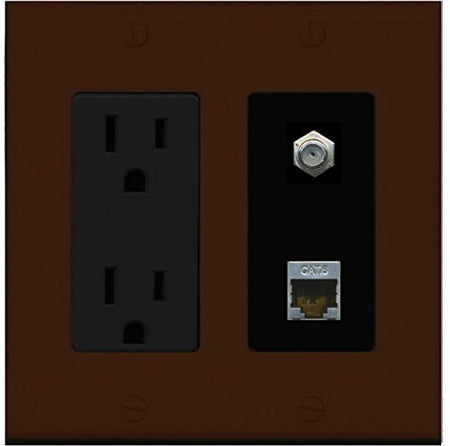RiteAV - 15 Amp Power Outlet 1 Port Coax Cable TV- F-Type and Shielded Cat6 Ethernet Wall Plate - Brown/Black