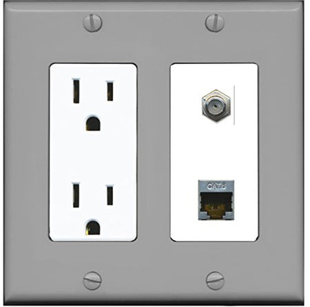 RiteAV - 15 Amp Power Outlet 1 Port Coax Cable TV- F-Type and Shielded Cat6 Ethernet Wall Plate - Gray/White