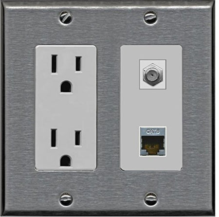 RiteAV - 15 Amp Power Outlet 1 Port Coax Cable TV- F-Type and Shielded Cat6 Ethernet Wall Plate - Stainless/Gray