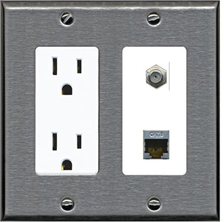 RiteAV - 15 Amp Power Outlet 1 Port Coax Cable TV- F-Type and Shielded Cat6 Ethernet Wall Plate - Stainless Steel/White