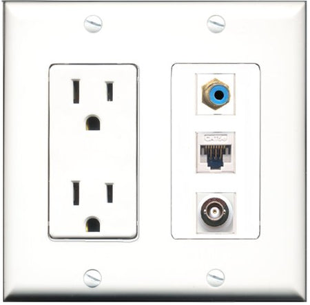 RiteAV - 15 Amp Power Outlet 1 Port RCA Blue 1 Port BNC 1 Port Cat5e Ethernet White Decorative Wall Plate