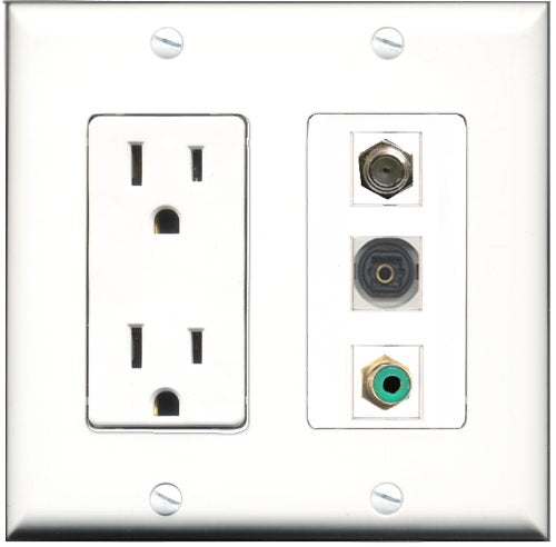 Please note: It is required to install this item in a divided outlet box. Recommended compatible outlet boxes Carlon BH234R (Old work). This is a 2 Piece Decorative Wall Plate (plate and plate cover). Tooless connection, Just plug one cable into the front and one into the back. Outlet needs to be hard wired as a regular outlet. High quality, screws included. Fits standard outlet boxes, decora(tive) plates and mounting brackets. Female on both sides of the plate jacks for easy plugin. 4 inch distance between screws. This is not a GFCI outlet and is not to be installed near or behind a kitchen sink, bathtub, bathroom or within 12-15 feet of any source of water. Must be installed into a new or existing plastic or metal outlet electrical box for safety. Do not install this with a drywall only mounting bracket.