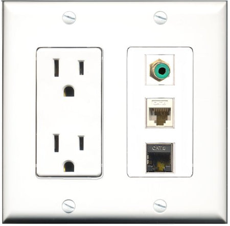 Please note: It is required to install this item in a divided outlet box. Recommended compatible outlet boxes Carlon BH234R (Old work). This is a 2 Piece Decorative Wall Plate (plate and plate cover). Tooless connection, Just plug one cable into the front and one into the back. Outlet needs to be hard wired as a regular outlet. High quality, screws included. Fits standard outlet boxes, decora(tive) plates and mounting brackets. Female on both sides of the plate jacks for easy plugin. 4 inch distance between screws. This is not a GFCI outlet and is not to be installed near or behind a kitchen sink, bathtub, bathroom or within 12-15 feet of any source of water. Must be installed into a new or existing plastic or metal outlet electrical box for safety. Do not install this with a drywall only mounting bracket.