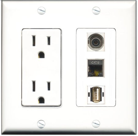 RiteAV - 15 Amp Power Outlet 1 Port USB A-A 1 Port Shielded Cat6 Ethernet Ethernet 1 Port 3.5mm Decorative Wall Plate
