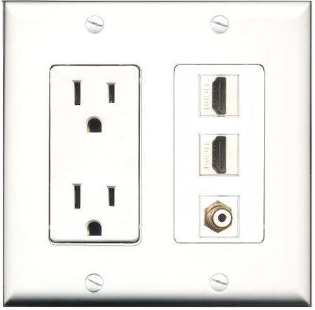 Please note: It is required to install this item in a divided outlet box. Recommended compatible outlet boxes Carlon BH234R (Old work). This is a 2 Piece Decorative Wall Plate (plate and plate cover). Tooless connection, Just plug one cable into the front and one into the back. Outlet needs to be hard wired as a regular outlet. High quality, screws included. Fits standard outlet boxes, decora(tive) plates and mounting brackets. Female on both sides of the plate jacks for easy plugin. 4 inch distance between screws. This is not a GFCI outlet and is not to be installed near or behind a kitchen sink, bathtub, bathroom or within 12-15 feet of any source of water. Must be installed into a new or existing plastic or metal outlet electrical box for safety. Do not install this with a drywall only mounting bracket.