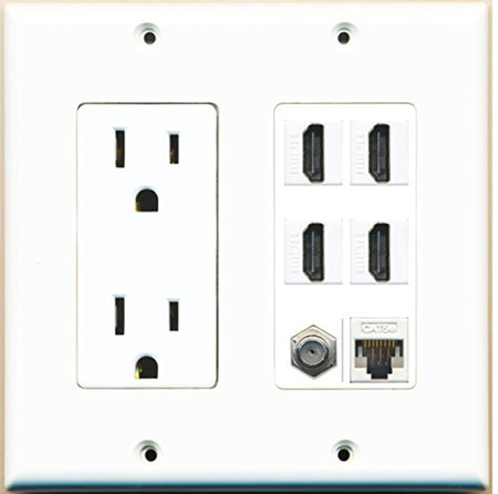 RiteAV 15A Power Outlet, 4 HDMI, 1 Cat5e Ethernet, 1 Coax Cable TV Wall Plate