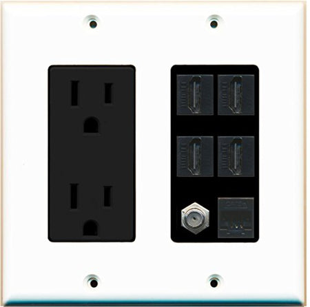 RiteAV 15A Power Outlet, 4 HDMI, 1 Cat5e Ethernet, 1 Coax Cable TV Wall Plate - White/Black