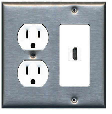RiteAV (2 Gang Decorative) 15 Amp Round Power Outlet HDMI TV Wall Plate - Stainless Steel/White