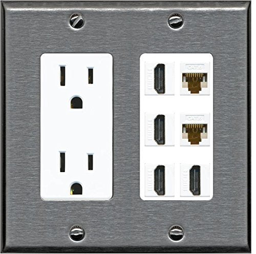 RiteAV - (2 Gang Decorative) 15A Outlet 4 HDMI 2 Cat6 Wall Plate Stainless Steel White