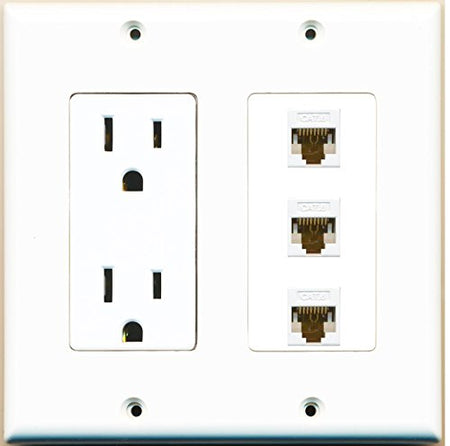 RiteAV (2 Gang Decorative) 15A Power Outlet 3 Cat6 White Wall Plate White