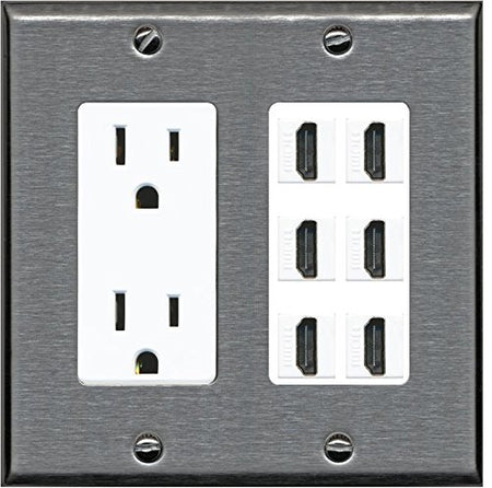 RiteAV - (2 Gang Decorative) 15A Power Outlet 6 HDMI Wall Plate Stainless Steel on White