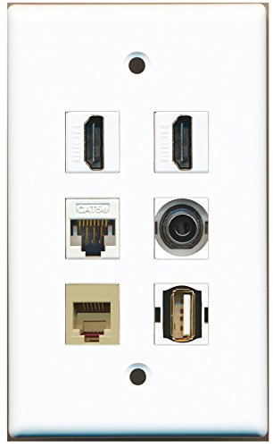 RiteAV - 2 HDMI 1 Port USB A-A 1 Port Phone RJ11 RJ12 Beige 1 Port 3.5mm 1 Port Cat5e Ethernet White Wall Plate