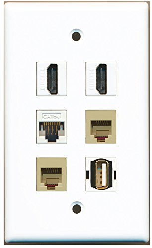 RiteAV - 2 HDMI 1 Port USB A-A 2 Port Phone RJ11 RJ12 Beige 1 Port Cat5e Ethernet White Wall Plate