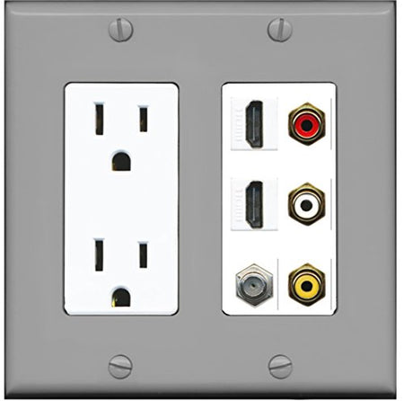 RiteAV - 2 x 15 Amp 125V Power Outlet 3 x RCA - 2 X HDMI and 1 x Coax Cable TV Port Wall Plate - Gray/White