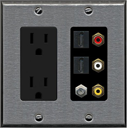 RiteAV - 2 x 15 Amp 125V Power Outlet 3 x RCA - 2 X HDMI and 1 x Coax Cable TV Port Wall Plate - Stainless/Black