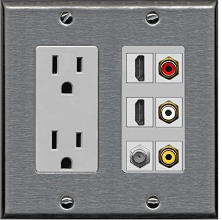RiteAV - 2 x 15 Amp 125V Power Outlet 3 x RCA - 2 X HDMI and 1 x Coax Cable TV Port Wall Plate - Stainless/Gray