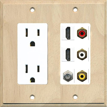 RiteAV - 2 x 15 Amp 125V Power Outlet 3 x RCA - 2 X HDMI and 1 x Coax Cable TV Port Wall Plate - Wood/White