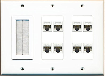RiteAV - (3 Gang) Mesh-Brush 8 Cat5e White Wall Plate White