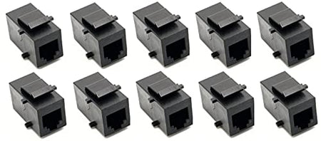 Details: RiteAV Black RJ11/RJ12 Phone Keystone Jack Female to Female are the same on the front and back, so you can connect your cabling to them in no time. Simply plug your terminated cables into both sides of the plate the same way. No tools are required. They're universally designed to easily fit standard-sized brand name keystone blank wall plates and fit seamlessly into all RiteAV Blank Wall Plates as well. Our RJ11/RJ12 Keystone Couplers are versatile, since they can also be used in surface mount boxes and patch panels that have a standard-sized opening. RiteAV Keystone Couplers are removable to allow for easy upgrades or plate re-configurations in the future. The sturdy construction of the couplers ensures a long service life and a simple, affordable way to keep your cables hidden. They also provide a neat, convenient way to extend cables that are already in place, without the need for relocating them. This discreet solution enables you to route your cabling through the walls and results in a clean, professional look behind wall mounted televisions, monitors, projectors and entertainment centers in both residential (home theater) and commercial (classroom, boardroom, factory floor, recording studio, etc.) settings. We offer a variety of couplers in an assortment of colors that all match our Blank Wall Plates to suit all of your A/V requirements. This listing is for a 10 Pack.