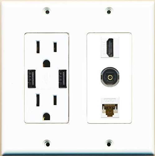 RiteAV Power Outlet 2 USB Charger HDMI Cat6 Ethernet Toslink Wall Plate White
