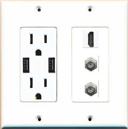 RiteAV Power Outlet 2 USB Charger HDMI White 2 Coax Wall Plate White