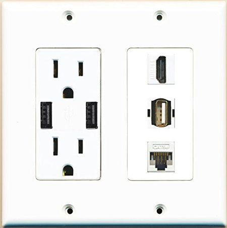 RiteAV Power Outlet 2 USB Charger HDMI White Cat5E USB A-A Wall Plate White