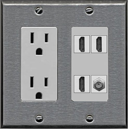 RiteAV Power Outlet 3 HDMI White Coax Wall Plate - Stainless Steel/Gray