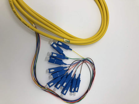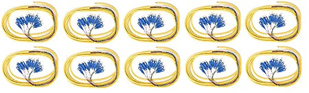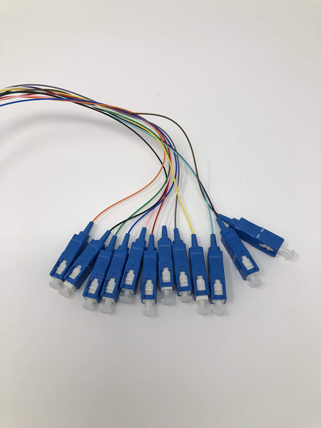 Details: Ultra Spec's 12 Strand Singlemode Pigtails are ideal for use in Optical Distribution Frames, enclosures or cable management boxes. They can be terminated by mechanical or fusion splicing. One end of the cable is blunt, so it can be easily spliced to the trunk, backbone or outside plant cable and the other end is terminated with 12 SC-UPC Connectors which connect to the end equipment, like an adapter panel or optical transceiver. The twelve, splice-ready 900um buffered cables are color-coded according to industry standards for easy identification and the pre-terminated connectors at the opposite end are machine polished for optimal performance. Each cable is fully inspected and contains a test report. Our pigtails are also available with different connectors, polishes, strand counts and styles; like armored and waterproof. This listing is for a 10 Pack.