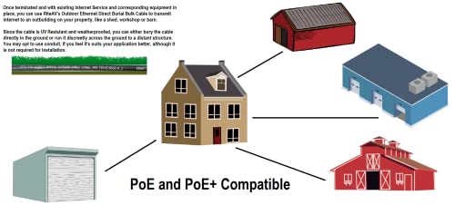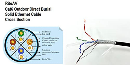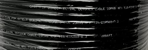 Details: Our Cat6 Outdoor Shielded Solid Direct Burial Bulk Cable is constructed of high quality materials and designed for permanent outdoor installations, either above or below ground. The cable is not terminated which gives the flexibility to make multiple runs from one large spool and terminate the cables onsite once they're installed. The raw, unterminated cable enables you to cut the cable to your required length and it's easier to run through an exterior wall, since the cable itself has a much smaller profile without the connector on it, therefore allowing you to drill a much smaller hole to fish it through. Foot markers on the jacket itself are useful when measuring and also knowing how much is left on the spool. The UV Resistant, Weatherproof Cable is rated for outdoor use and essentially capable of handling all environmental variables. It has a wide Operating Temperature Range and it's specialized jacket that protects the cable from damage caused by exposure to water and sunlight and is both sturdy and resistant to heat, cracks and tears, therefore making it suitable for both outdoor and harsh environments. The 23AWG, 4 Pair Solid Cable is constructed of 100% Bare Copper Wires ensuring clear transmission and the cable's shielding helps to eliminate EMI/RFI and crosstalk and the result is superior performance and enhanced data integrity. The overall robust construction makes the cable solid and sturdy, yet it's still pliable so it's easy to work with. Our cable can be deployed across a rooftop, lashed to an existing cable on a telephone pole or buried partially or fully underground so it's perfect for use in multi-building campus networks and in residential networking applications for data, voice and video that require ethernet to transmit signals or power devices like Security Cameras, Intercoms or Access Points. We also offer pre-terminated Cat5E/Cat6 Options as well bundles that include the compatible RJ45 Shielded Connectors and hand tool.