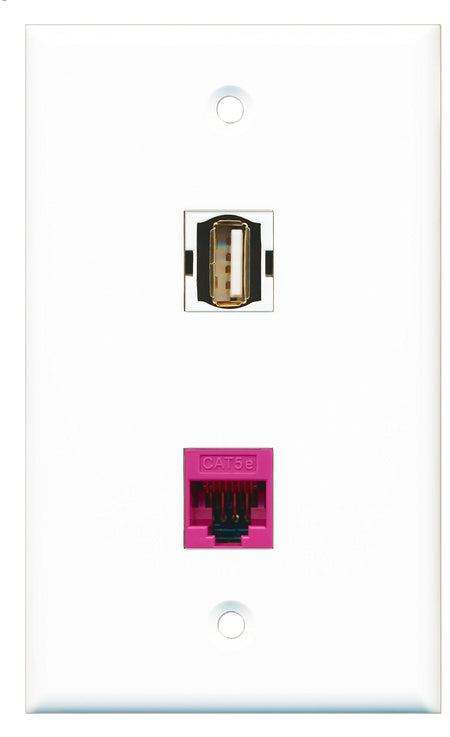 RiteAV - 1 Port USB A-A - 1 Port Cat5e Ethernet Pink Wall Plate White - Bracket Included